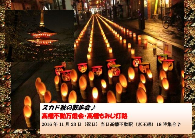 高幡不動尊萬燈会・たかはたもみじ灯路2017.11.23(祝日) 今年も「高幡不動尊」、参道商店街で開催されます「高幡不動尊萬燈会・ たかはたもみじ灯路」へ参加したいと思います♪ 厳かに行われる萬燈会、ライトアップされた高幡不動尊五重塔及び山の 紅葉。幻想的な雰囲気をかもし出す商店街路面に置かれた蝋燭の灯り。 楽しいですよ♪今年は紅葉の色付きも、丁度良いようです♪ 11月23日木曜日(祝日) 午後18時、京王線高幡不動駅改札口集合♪ イベント終了後はスカドにて飲み会♪ よろしくお願いいたします!