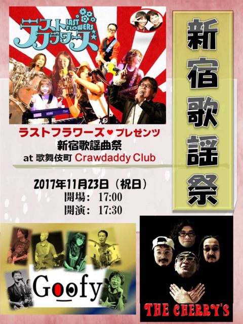 11/23 本日のライブ 『ラストフラワーズプレゼンツ〜 昭和歌謡祭』 OPEN 17:00 START 17:30 CHARGE 1500円 act ラストフラワーズ Goofy The Cherry's