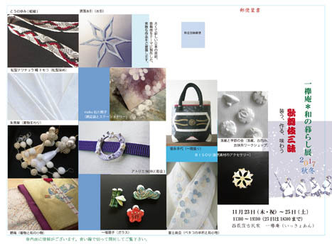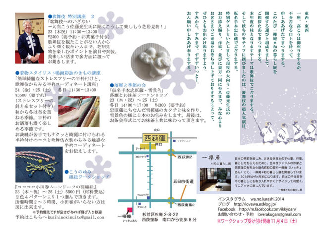 西荻窪の有形文化財古民家 一欅庵(いっきょあん)で、 手仕事の作家ぎ今に使える「着物と和の暮らし」の提案。 秋冬の三日間、開催です。 今年のテーマは、歌舞伎。 暮れの日本の風物詩「仮名手本忠臣蔵」の世界から広がる 2017年を楽しみ尽くし、新しい年へのお支度のお披露目です。 ◆ 日時 ◆ 2017 年 11月 23日(木祝)24日(金) 11:00〜19:00 25日(土)11:00〜18:00 ◆ 場所 ◆ 有形文化財古民家 一欅庵(いっきょあん) 東京都杉並区松庵 2-8-22 西荻窪駅 南口から徒歩8分 ◆ 参加作家 ◆ ・朱音屋(着物まわり)