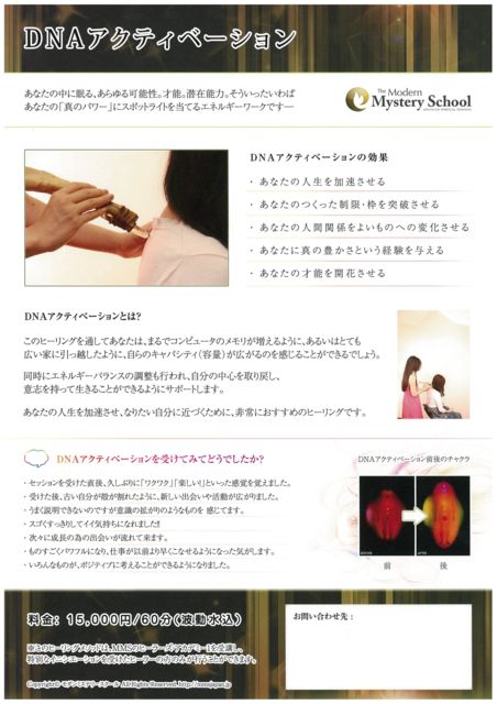 ✿DNAアクティベーション \15,000(1時間)デトックスを促す波動水付き→モニター価格 無料 期間:11/23〜12月末 定員になり次第終了 全てのヒーリングで1番最初に受けることをおススメするヒーリングです 潜在意識を活性化することで、その人が本来持っている力を引き出します。 人間のDNA(遺伝子)には24本のストランドと呼ばれる鎖があり、その人の元となる情報の全てが記録されています。 そのストランドを特殊なクリスタルを使って活性化(アクティベーション)していきます。するとみるみる人生も活性化していく