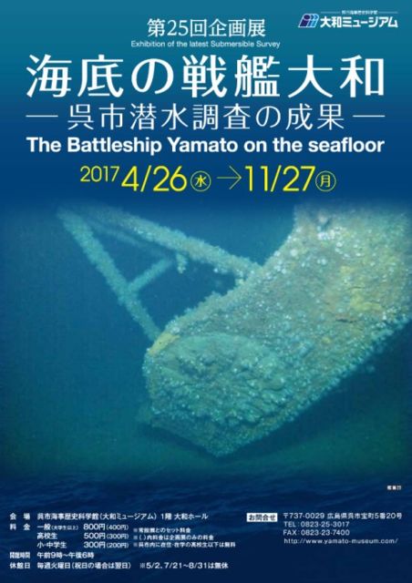 第25回企画展 「海底の戦艦大和 ―呉市潜水調査の成果―」 The Battleship Yamato on the seafloor http://yamato-museum.com/info/%E7%AC%AC25%E5%9B%9E%E4%BC%81%E7%94%BB%E5%B1%95%E3%80%8C%E6%B5%B7%E5%BA%95%E3%81%AE%E6%88%A6%E8%89%A6%E5%A4%A7%E5%92%8C%E3%80%8D/ 平成28年5月に実施した戦艦「大和」潜水調査の成果をもとに、企画展を開催します。過去の潜水調査を振り返りながら、今回の調査映像を展示します。 場所 大和ミュージアム1階大和ホール 会期 平成29年4月26日(水曜日)〜11月27日(月曜日) 料金 一般(大学