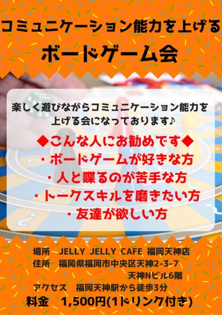 楽しく遊んで能力アップできる一石二鳥なイベントです(*^^*) 日時 11月27日 13:00〜16:00&18:00〜21:00 場所 JerryJerryCafe 天神店 金額 1500(税込)1ドリンク付き