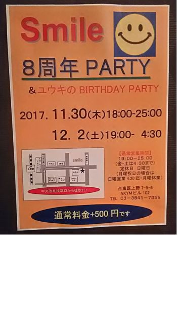 Smile¤Ï¤³¤Î¤¿¤Ó£¸¼þǯ¤ò·Þ¤¨¤Þ¤·¤¿¡£ ¤³¤È¤·¤â¥æ¥¦¥·¯¤Î¥Ð¡¼¥¹¥Ç¡¼¤Ç¤¢¤ë11·î30Æü¡ÊÌÚ¡Ë¤È ¤½¤Î½µËö12·î£²Æü¡ÊÅڡˤ˥ѡ¼¥Æ¥£¡¼¤ò¹Ô¤¤¤Þ¤¹¡£ 11·î30Æü¡ÊÌÚ¡Ë 18¡§00¡Á25¡§00 ¥¹¥¿¥Ã¥Õ¡§¤»¤¤¤¹¤±·¯ 12·î£²Æü¡ÊÅÚ¡Ë 19¡§00¡Á4¡§30 ¥¹¥¿¥Ã¥Õ¡§Âç»Ö·¯¡¢·ò·¯¡¢¥Ï¥¤¥í·¯ ÎÁ¶â¤ÏÄ̾ïÎÁ¶â+500±ß¤È¤Ê¤ê¤Þ¤¹¡£