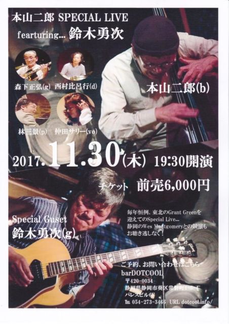 ¢¡£±£±·î£³£°Æü¡¡ËÜ»³ÆóϺ SPECIAL Live featuring ÎëÌÚͦ¼¡(g)¢¡ ¢£Date 2017/11/30(Thu) ¢£Open 19:00¡¡¢£Start 19:30 ¢£Ticket Adv;\6,000-¡ÊDrinkÊÌÅÓ¡Ë ¢£Place DOTCOOL¡ÊÀŲ¬»Ô°ª¶è¾ïÈØÄ®1-5-4 ¥Ñ¥ì¥¹¥Ó¥ë£¶£Æ¡Ë ¡¡ä 054-273-3466 ¡¡http://www2.tokai.or.jp/DOTCOOL/ ¢£Member ¡¡ËÜ»³ÆóϺ(b) ¡¡¿¹²¼Àµ¹°(g) ¡¡À¾Â¼ÈæÏ¤¹Ô(d) ¡¡ÎÓ»°·Ê(p¡Ë ¡¡ÃçÅÄ¥µ¥ê¡¼(vo) ¢öGuest¢ö ¡¡ÎëÌÚͦ¼¡(g) Ëèǯ¹±Îã¡¢ÅìË̤ÎGrant Green¤ò·Þ¤¨¤Æ¤ÎSpecial Live... ÀŲ¬¤ÎWes Montgomery¤È¤Î¶¥±é¤â¤ªÄ°¤Æ¨¤·¤Ê¤¯¡Ä