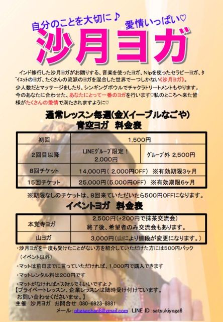 【時間】 18時半受付開始 19時から20時半で、行います。 【参加費】 初回1500縁 【持ち物】 身軽な服装、飲み物、マット〔マットがない方はバスタオル〕 マットレンタル料は200縁です。 【場所】 イーブルなごや 【住所】 郵便番号460-0015 名古屋市中区大井町7 番25号 2階の第一和室 【交通】 名城線〈東別院〉下車1番出口から徒歩3分 駐車場 49台 〈30分以上一回300円〉 《沙月ヨガホームページ》 http://satukiyoga.wix.com/yoga-instructor 皆が健康で心から幸せになってほしいから★