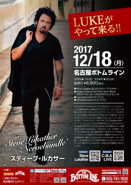 突然の告知を失礼致します。。。 TOTOのギタリスト、 スティーブルカサー名古屋公演!! 新譜を引っ下げジャパンツアー決行★ 2017年12月18日(月) @名古屋ボトムライン ◎ボトムラインにて発売中!! ↓ Web予約はこちらから ↓ http://www.bottomline.co.jp/bottomline/4879/ <お問い合わせ> ボトムライン:052-741-1620 http://www.bottomline.co.jp <スティーブルカサー特設FBページ> https://www.facebook.com/stevelukather.nagoya *拡散・シェア、宜しくお願い致します*