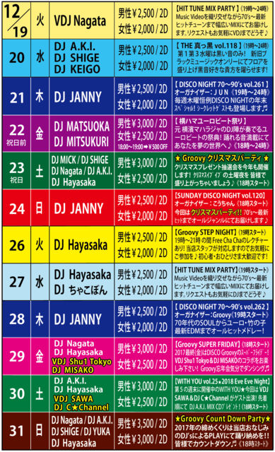 ¡Ú¥Ö¥é¥Ã¥¯¥ß¥å¡¼¥¸¥Ã¥¯¹¥¤¤ÊÊý¤ªÂÔ¤Á¤«¤Í¡ª¡Û 12·î¤ÎÂè1¡õÂè3¿åÍˤϡª ¹õ¤¤²»¤Î¤ß¤Ç¥Õ¥í¥¢¤òÀ¹¤ê¾å¤²Â³¤±¤ë¡ÚTHE ¿¿¤Ã¹õ¡Û¾Æü¤ÎDISCO Groovy¤Ç¤Ï¤Ê¤«¤Ê¤«Ä°¤¯¤³¤È¤Î¤Ç¤¤Ê¤¤¥ì¥¢¤ÊFUNK¡õSOUL MUSIC¤òÀ§Èó¤´´®Ç½¤¯¤À¤µ¤¤¢ö ¡ÚDJ's¡Û A.K.I. / SHIGE / KEIGO ¡Ú²»³Ú¡Û BLACK ALL MIX ¡Ú³«ºÅ»þ´Ö¡Û 19:00¡Á24:00 ¡ÚÎÁ¶â¡Û ÃËÀ¡§¡ï2,500 / 2Drinks ½÷À¡§¡ï2,000 / 2Drinks