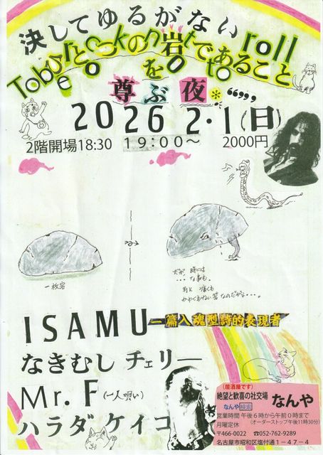 Ëèǯ¹±Î㡢Ʊ»þ´ü¤Ë"Àä˾¤È´¿´î¤Î¼Ò¸ò¾ì"¸æ´ï½ê¡Ö¤Ê¤ó¤ä¡×¤Ç³«ºÅ¤µ¤ì¤ëMr.F»á´ë²è¥é¥¤¥Ö¡£ ÆÃ¤Ëº£²ó¤Ï´ë²è¼ÔMr.F»á¤Î¤È¤Æ¤âÂçÀÚ¤ÊÂ礤ÊÀáÌܤȤʤ뤪¤á¤Ç¤¿¤¤µÇ°Æü¤ÎÁ°Ìë¤È¤Ê¤ê¤Þ¤¹¡£ ▢2/1¡ÊÆü¡Ë Mr.F´ë²è ÂêÌÜ: ·è¤·¤Æ¤æ¤ë¤¬¤Ê¤¤¤Ò¤È¤Ä¤Î"´ä"¤Ç¤¢¤ë¤³¤È¤òº¤ÖÌë ¾ì½ê: ¸æ´ï½ê¡Ö¤Ê¤ó¤ä¡× http://www.nanyagokiso.com ½»½ê: °¦Ãθ©Ì¾¸Å²°»Ô¾¼Ï¶è±öÉÕÄÌ1-47-4 ¸òÄÌ: ̾¸Å²°»Ô±ÄÃϲ¼Å´ÄáÉñÀþ¡¦ºùÄÌÀþ¡Ö¸æ´ï½ê¡×¡½Ð¸ý¤è¤êÅÌÊâÌó5ʬ¡£ ÅÅÏÃ: 052-762-9289 »þ´Ö: 2³¬18:30³«¾ì(18:00³«Å¹)/19:30³«±é ÎÁ¶â: 2000±ß(ÊÌÅÓ°û¿©Âå) ½Ð±é: ◉