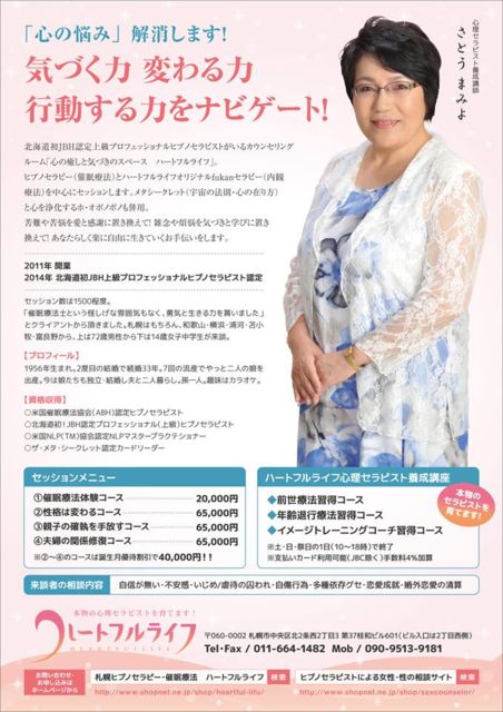 人生を楽しむナビゲーターさとうまみよ 〜ヒプノ☆fukan☆ヒーリング〜 本来のあるべきあなたにリセットし 人生をシンプルにそして豊かに楽に 生きて行くお手伝いをします 1500人の 潜在意識と成育歴に耳を傾け 寄り添い癒し慰め励まし 元気になって お帰り頂いています。 セッション1日コース65000円 ○場所 札幌北2西2 第37桂和ビル ○土日祭日 10時〜18時 HP http://www.shopnet.ne.jp/shop/heartful-lifu/ ご予約 https://ssl.form-mailer.jp/fms/e86ae54f408828 & 【占い】 夢叶メッセンジャー