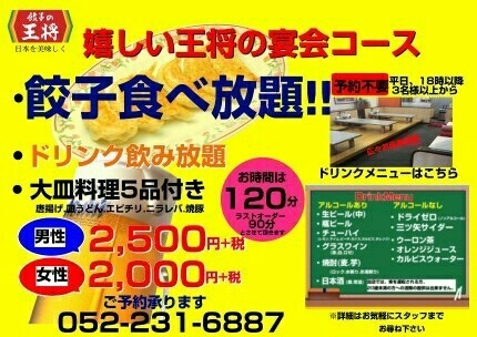 ñ»Ò¤Î²¦¾ Âç¿Ü´Ñ²»Å¹¤ÎͽÌó¼è¤ì¤Þ¤·¤¿¡£ ñ»Ò¿©¤ÙÊüÂê¡¢ÅâÍȤ²¡¢»®¤¦¤É¤ó¡¢¥¨¥Ó¥Á¥ê¡¢¥Ë¥é¥ì¥Ð¡¢¾ÆÆÚ¤ÎÂç»®ÎÁÍý5ÉʤÈ120ʬ¤Î°û¤ßÊüÂê(¥é¥¹¥È¥ª¡¼¥À¡¼¤Ï30ʬÁ°)¤¬ÉÕ¤¤¤Æ¡¢ÃËÀ2,700±ß¡¢½÷À2,160±ß¤Ç¤¹¡£ °û¤ßÊüÂê¥á¥Ë¥å¡¼ À¸¥Ó¡¼¥ë(Ãæ)¡¢ÉÓ¥Ó¡¼¥ë¡¢¥É¥é¥¤¥¼¥í(¥Î¥ó¥¢¥ë)¡¢¥Á¥å¡¼¥Ï¥¤¡¢¾ÆÃñ(ÇþŽ¥°ò)¡¢ÆüËܼò¡¢»°¥ÄÌ𥵥¤¥À¡¼¡¢¥¦¡¼¥í¥óÃã¡¢¥ª¥ì¥ó¥¸¥¸¥å¡¼¥¹¡¢¥«¥ë¥Ô¥¹¥¦¥©¡¼¥¿¡¼
