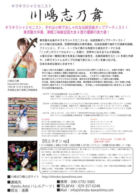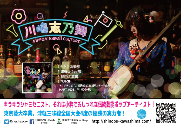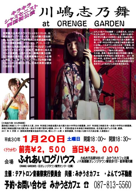 昨年、日本の芸術大学のトップレベルの東京芸術大学を卒業し、プロ三味線奏者として活動中の、『しのぴー』こと川嶋志乃舞さんをお迎えしてのライブ開催です。 数々の三味線大会で4度の日本一のタイトルを獲得。 更に『シャミセニスト』として『ニッポンカワイイカルチャー』を世界に発信すべく古典邦楽から小粋でオシャレpopな作曲で新たなニッポンを発信中。 四国初公演の川嶋志乃舞ライブをぜひお楽しみに♪ 川嶋志乃舞『津軽じょんがら節』 https://youtu.be/BdrJ7i3awVE 開催日時:平成30年1月20日土曜日 開場PM18:00〜 開