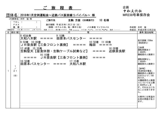 2018年最初の運転会は近鉄バス阪奈線リバイバルです。 梅田→近鉄奈良駅の路線をたどります。途中生駒聖天(宝山寺)に立ち寄り、昼食休憩を兼ねて生駒ケーブルの乗車体験をしていただくこともできるようにしてあります。 休止となってしまった近鉄バス阪奈線を再びたどることができる貴重な機会です。 ○実施日:2018年1月21日(日) ○集合場所・時間 大和八木駅南口 8:45発 田原本バスセンター 9:10発 JR奈良駅(三条フロント裏) 10:00発 ○注意事項 大阪府内については休憩以外は通過の予定です。 ○会費 運転体験あ