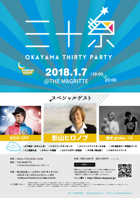 2018.1.7(SUN)¡Ô²¬»³¸©»°½½º×¡Õ¡¡ Æð¼°globe¤«¤é¤Î¥á¥Ã¥»¡¼¥¸¥Ó¥Ç¥ª https://www.youtube.com/watch?v=zjjCwgnj344 ¤ªÆÀ¤ÊÁá³ä¥Á¥±¥Ã¥È¡¦¾ÜºÙ¤Ï¤³¤Á¤é ¢ª http://30sai-okayama.jp/ ²¬»³¸©»°½½º× 2018.1.7(SUN)19:00-23:00 ¢¨ÍâÆü¤ÏÀ®¿Í¤ÎÆü¤Ç½ËÆü @THE MAGRITTE (²¬»³»ÔË̶è´Ý¤ÎÆâ£±ÃúÌÜ£µ¡Ý£¸) ÎÁ¶â:Áá³ä3000±ß ÅöÆü4000±ß(¥ï¥ó¥É¥ê¥ó¥¯ÊÌ) ¢¨Áá³ä¥Á¥±¥Ã¥È¤Ï¸ø¼°HP¤«¤é¤ªµá¤á失¤Þ¤¹¡£ ¢¨º£Ç¯»°½½ºÐ¤Ë¤Ê¤ëÊý¤òÃæ¿´¤Ë¡¢²¬»³¤Î»°½½ºÐ¤ò½Ë¤Ã¤Æ¤¯¤À¤µ¤ëÊý¤Ê¤éÆó½½ºÐ°Ê¾å¤Ç¤¢¤ì¤Ð¤É¤Ê¤¿¤Ç¤âÆþ¾ì²Äǽ¤Ç