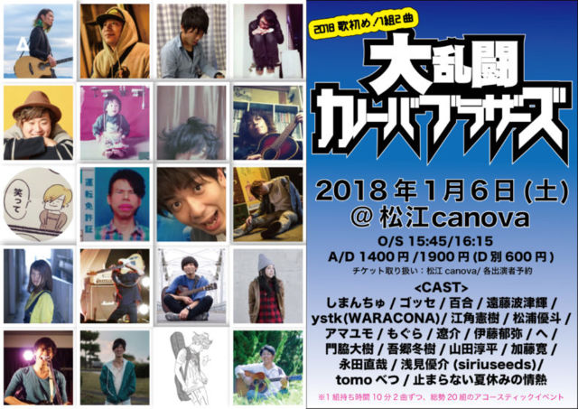 2018/1/6(sat) 松江canova 2018年歌初め!1組2曲大乱闘カノーバブラザーズ <CAST> アマユモ(※秋山) しまんちゅ ゴッせ 百合 遠藤波津輝 ystk(WARACONA) 江角憲樹 松浦優斗 もぐら 遼介 伊藤郁弥 へ 門脇大樹 吾郷冬樹 山田淳平 加藤寛 永田直哉 浅見優介(siriuseeds) tomoべつ 止まらない夏休みの情熱 O/S 15:45/16:15 A/D 1400yen/1900yen(要D代別600yen) ※2018年からドリンク代600円に変更 出演順は当日くじ引きで決定のため、当日の16:00前に公開予定。 松江canovaの2018年一本目のイベントに、秋山・島田両