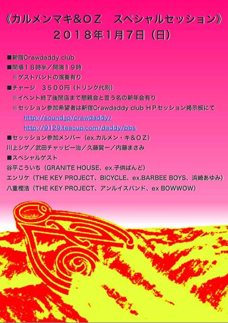 1/7 本日は《カルメンマキ&OZ スペシャルセッション》 ■開場18時半/開演19時 ※ゲストバンドの演奏有り ※カルメンマキ&OZのリズム隊《川上シゲ、武田チャッピー治》をメインに多数のゲストミュージシャンが参加! ■チャージ 3500円(ドリンク代別) ※イベント終了後閉店まで懇親会と言う名の新年会有り