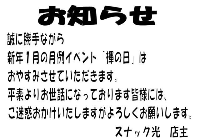 まことに勝手ながら 新年1月の月例イベント『褌の日』は おやすみさせていただきます。 平素よりお世話になっておりますみなさまには ご迷惑おかけいたしますがよろしくお願いします。