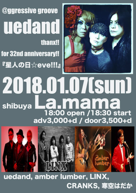 18.01.07(sun) shibuya La.mama 03-3464-0801 ¡Øuedand 32nd anniversary gig!!! À±¿Í¤ÎÆü¡ùeve¡ª¡Ù 18:00 open / 18:30 start adv3,000+D / door3,500+D uedand, CRANKS, amber lumber, LINX, ´¨¶õ¤Ï¤À¤« after party¥¢¥ê(Í×ͽÌó¡§2,000±ß¡¿¥Ä¥Þ¥ßÉÕ¤¡¢Í½»»ÆâÆÝ¤ßÊüÂꡢͽ»»½ªÎ»¸å¥¥ã¥Ã¥·¥å¥ª¥ó¡¢¡Á4:30am)