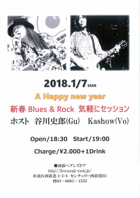 2018.1/7 ¡ú¿·½ÕBlues & Rock µ¤·Ú¤Ë¥»¥Ã¥·¥ç¥ó¡ú¡¡¡¡Á´¥Ñ¡¼¥È»²²Ã¼ÔÊ罸 ¥Û¥¹¥È ¡§¡¡Ã«Àî»ËϺ (Gu)¡§ Kashow(Vo) ¡üOpen/18:30 Start/19:00 ¡üCharge/\2.000+1Drink ¢£À¾²®¥Ø¥Ö¥ó¥º¥É¥¢ ¡ü¿ùʶèÀ¾²®ËÌ 3-3-6 ¥»¥ó¥Á¥å¥ê¡¼À¾²®·¦£Â1 ÅÅÏã°£³¡Ý£¶£¶£¶£±¡Ý£±£µ£µ£µ