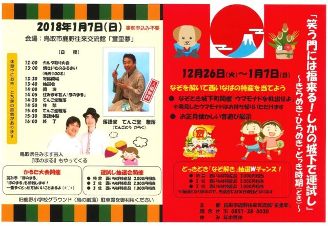 ほのまるさんのイヴェント出演が決定いたしました。 『笑う門には福来る! しかの城下で運試し〜きらめき・ひらめき・どっき時期(どき)〜』 https://goo.gl/M4gybo 【日時】 2018年1月7日(日) 12時〜16時 【会場】 鳥取市鹿野往来交流館 童里夢(ドリーム) 鳥取県鳥取市鹿野町鹿野1353 http://shikano-dream.jp/ 【出演】 ほのまる 他