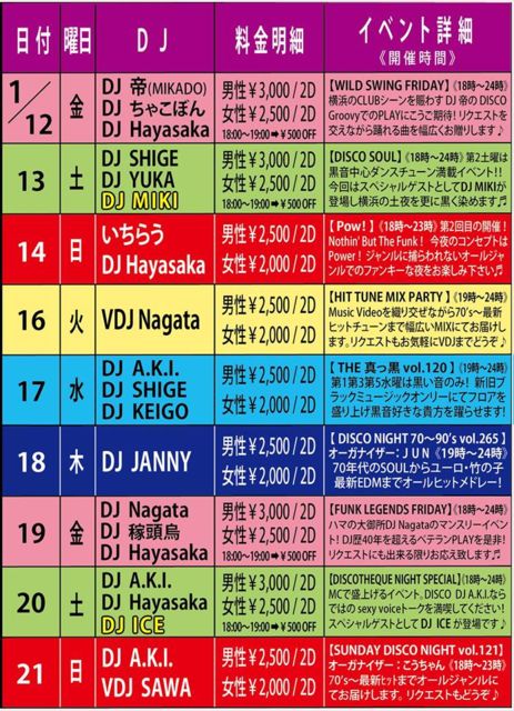 2018ǯ1·î¤ÎÂè2¡õÂè4¶âÍËÆü¤Ï¡ª ¸½ºß²£ÉͤÎCLUB¥·¡¼¥ó¤òÇ®¤¯Æø¤ï¤¹¡Ô DJ Äë¡úhttp://profile.ameba.jp/djmikado/ ¡Õ ¤ÎDISCO Groovy¤Ç¤ÎPLAY¤Ë¤´´üÂÔ¤¯¤À¤µ¤¤¡ù º£²ó DJ ¤Á¤ã¤³¤Ü¤ó¤¬»²À路¹¹¤ËÀ¹¾å¤²¤Þ¤¹¡ª ¥ê¥¯¥¨¥¹¥È¤Ë¤â½ÐÍè¤ë¸Â¤ê¤´ÂбþÃפ·¤Þ¤¹¤Î¤ÇDJ¤Þ¤Ç¤ªµ¤·Ú¤Ë¤É¤¦¤¾¢ö ¡Ú²»³Ú¡Û¥ª¡¼¥ë¥¸¥ã¥ó¥ë Dance Classics¡¢Soul¡¢Funk¡¢R&B¡¢Hip-Hop¡¢EDM¡¢Euro¡¢etc... ¡Ú³«ºÅ»þ´Ö¡Û 18¡§00¡Á24¡§00 ¡Ú¥Ï¥Ã¥Ô¡¼¥¢¥ï¡¼ÎÁ¶â / 18:00¡Á19:00¤Ë¤´ÍèŹ¤ÎÊý¡Û ÃËÀ¡§¡ï2,500 / 2Drinks ½÷À¡§¡ï2,000 / 2Drinks ¡ÚÎÁ¶â / 19:00°Ê¹ß¤´ÍèŹ¤ÎÊý