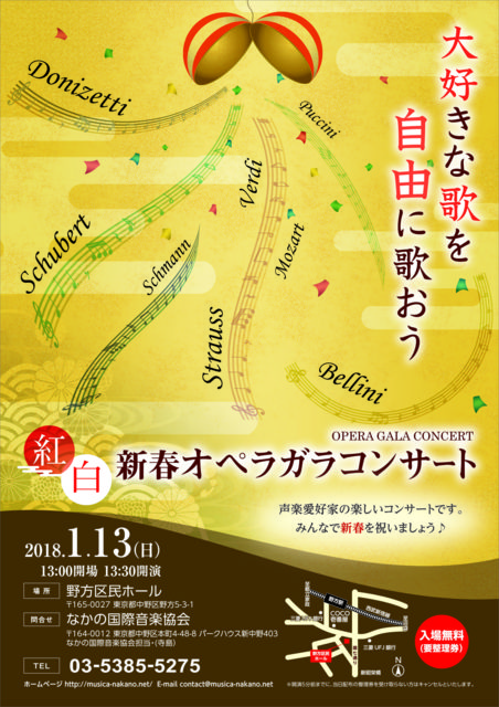 声楽愛好者たちの楽しいコンサートです。 みんなで新春を祝いましょう♪ http://musica-nakano.net/ なかの国際音楽協会 〒164-0012 東京都中野区本町4丁目48-8-403 電話番号 03(5385)5275 メール contact@nakano-net
