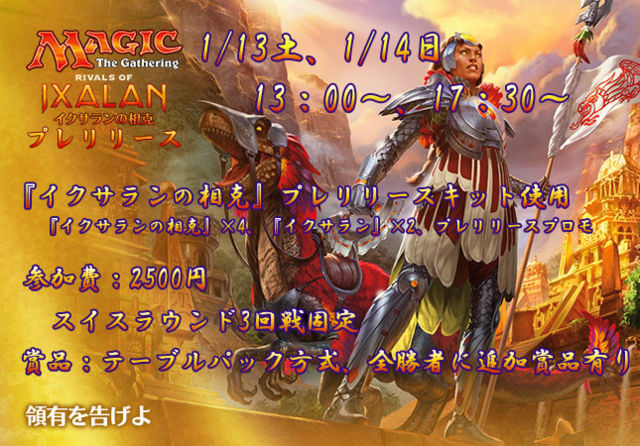 DCI公認シールド戦 イクサランの相克 プレリリース#1 のご案内です。 受付は 予約 12:45 当日 13:00 となっておりますので参加希望の場合は上記の時間に遅れないようにご来店ください。 なお参加費は2500円となっております。 形式は新セット『イクサランの相克』のプレリリース・キットを使用したシールド戦となります。 賞品はテーブルパック方式となります。(※マッチの勝者に『イクサランの相克』を1パック進呈、大会終了後全敗だった場合も参加賞として『イクサランの相克』を1パック進呈します。) 全勝だったプレイヤーには