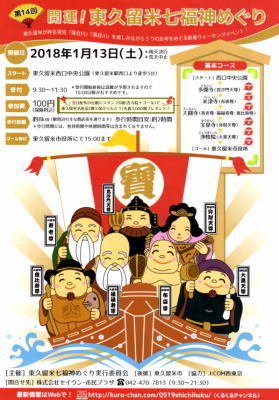 ***** 第117回三多摩エンジョイツアー 1月13日(土) 『東久留米七福神めぐりと新年会(そして、少しるーみっくな世界へ)』 毎年1月は皆さんの幸せを願って、 七福神巡りをしておりますが、 今年セレクトしたのは、2011年以来、三多摩的には7年振りとなる『開運! 東久留米七福神めぐり』 です! 西口中央公園を出発し、七福神をめぐって東久留米市役所をゴールとする約8kmのコースです。 また、東久留米市には『関東の富士見百景』に選定されている場所があります。 こりゃ縁起が良いや!と、そちらもご案内! 七福神めぐり
