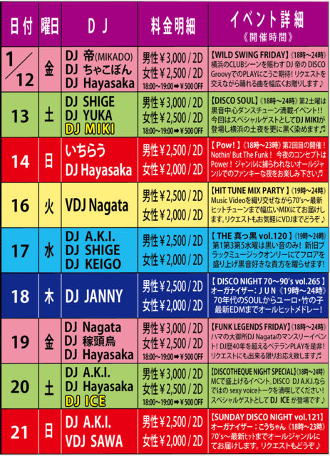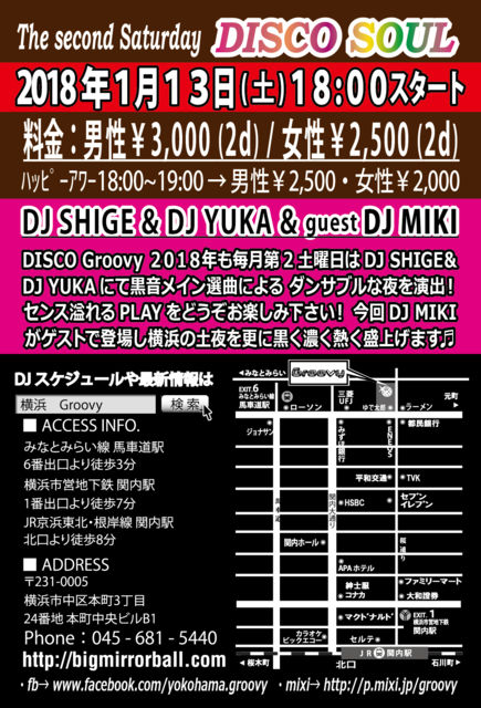 DISCO Groovy 2018ǯ¤âËè·îÂè2ÅÚÍËÆü¤Ï¡ª¡ÚDJ SHIGE ¡õ DJ YUKA¡Û¤Ë¤Æ¤ª¤Ê¤¸¤ß¡¢¹õ²»Ãæ¿´¤ÎÍÙ¤ì¤ëÌë¤ò±é½Ð¤·¤Þ¤¹¡ª º£²ó¤Ï¥¹¥Ú¥·¥ã¥ë¥²¥¹¥È¤È¤·¤Æ¡ÚDJ MIKI¡Û¤¬Åо줷¥µ¥¿¥Ç¡¼¥Ê¥¤¥È¤ò¹¹¤Ë¹õ¤¯À¹¾å¤²¤Þ¤¹¢ö ²£Éͤʤé¤Ç¤Ï¤Î¡ÔDisco Soul Saturday Night¡Õ¤ò³§ÍͤǤɤ¦¤¾¤ª³Ú¤·¤ß¤¯¤À¤µ¤¤¡ú ¡Ú²»³Ú¡Û Soul¡¢Funk¡¢Dance Classics¡¢R&B¡¢Hip-Hop¡¢etc... ¡Ú³«ºÅ»þ´Ö¡Û 18:00 ¡Á 24:00 ¡Ú¥Ï¥Ã¥Ô¡¼¥¢¥ï¡¼ÎÁ¶â / 18:00¡Á19:00¤Ë¤´ÍèŹ¤ÎÊý¡Û ÃËÀ¡§¡ï2,500 / 2Drinks ½÷À¡§¡ï2,000 / 2Drinks ¡ÚÎÁ¶â / 19:00°Ê¹ß¤´ÍèŹ¤ÎÊý¡Û ÃËÀ¡§¡ï3,00