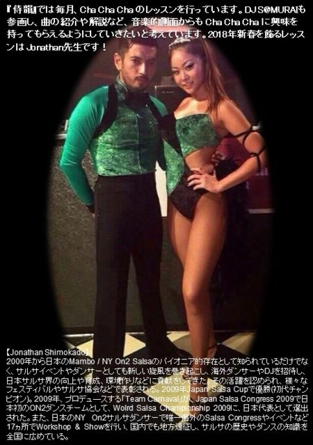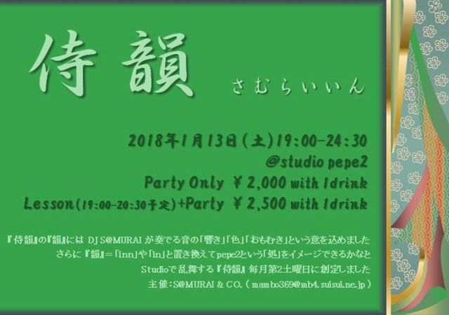 studio pepe2¤ÇÍðÉñ¤¹¤ë¡¡DJ S@MURAI¥ª¡¼¥¬¥Ê¥¤¥º¥¤¥Ù¥ó¥È¡Ø»ø±¤¡Ù¡¢ 2018ǯ¿·½Õ¤ò¾þ¤ë1·î¤Î¡Ø»ø±¤¡Ù¤Ï¡¢13Æü(ÅÚ) ³«ºÅ¤Ç¤¹¡£ ¹¥É¾Äº¤¤¤Æ¤¤¤ë¡ÖCha Cha Cha¡×¤Î¥ì¥Ã¥¹¥ó¤Ë¤ÏDJ S@MURAI¤â»²²Ã¤·¡¢ ¶Ê¤Î¾Ò²ð¤ä²òÀâ¤Ê¤É¡¢²»³ÚŪ¦Ì̤«¤é¡ÖCha Cha Cha¡×¤Ë¶½Ì£¤ò»ý¤Ã¤Æ ¤â¤é¤¨¤ë¤è¤¦¤Ë¤È¹Í¤¨¤Æ¤¤¤Þ¤¹¡£ º£·î¤Î¥ì¥Ã¥¹¥ó¤Ï¡¢JonathanÀèÀ¸¤Ë¤ª´ê¤¤¤·¤Þ¤·¤¿¡ª ¡Ø»ø±¤¡Ù¤Î¡Ø±¤¡Ù¤Ë¤ÏS@MURAI¤¬ÁդǤ벻¤Î¡Ö¶Á¤¡×¡Ö¿§¡×¡Ö¤ª¤â¤à¤¡× ¤È¤¤¤¦°Õ¤ò¹þ¤á¤Þ¤·¤¿ ¤µ¤é¤Ë ¡Ø±¤¡Ù¡á¡Öinn¡×¤ä¡Öin¡×¤ÈÃÖ¤´¹¤¨¤Æpepe2¤È¤¤¤¦¡Ö½è¡×¤ò ¥¤¥á¡¼¥¸¤Ç¤¤ë