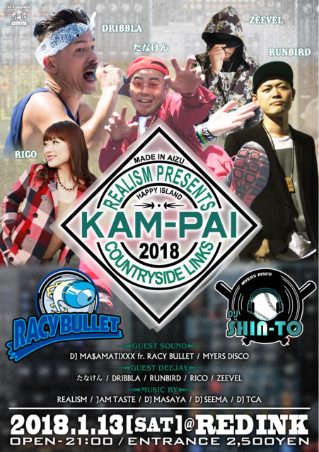 COUNTRYSIDE LINKS KAM-PAI 2018.1.13(SAT) @REDINK Ê¡Å縩²ñÄż㾾»Ô±ÉÄ®12¡Ý4 B1F OPEN 21:00 ENTRANCE 2,500YEN ¡ÔGUEST SOUND¡Õ MASAMATIXX fr RACY BULLET MYERS DISCO ¡ÔGUEST DEEJAY¡Õ DRIBBLA ¤¿¤Ê¤±¤ó RUNBIRD RICO ZEEVEL ¡ÔMUSIC BY¡Õ REALISM JAM TASTE DJ MASAYA DJ SEEMA DJ TCA
