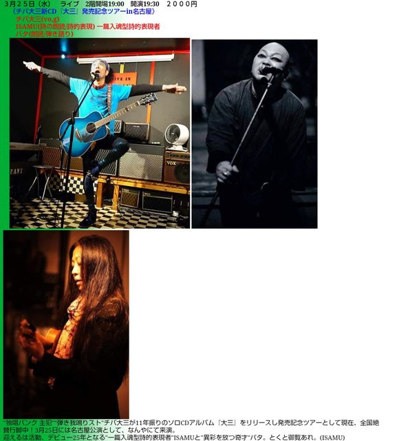 "ÆÈ¾§¥Ñ¥ó¥¯¼çºË"¥Á¥ÐÂç»°»á¤Î11ǯ¿¶¤ê¤Î¥½¥íCD¥¢¥ë¥Ð¥à¡ØÂç»°¡ÙȯÇ䵭ǰ¥Ä¥¢¡¼¤È¾Î¤·¤ÆÁ´¹ñ¥Ä¥¢¡¼(ÅìËÌ¡¢´ØÅì(ËÌ´ØÅì´Þ¤à)¡¢´ØÀ¾¡¢»Í¹ñ¡¢Ãæ¹ñ(»³¸ý)¡¢¶å½£(²­Æì))¤Î̾¸Å²°¸ø±é¡£ ▢3/25¡Ê¿å¡Ë ÂêÌÜ: ¥Á¥ÐÂç»° CD¥¢¥ë¥Ð¥à¡ØÂç»°¡ÙȯÇ䵭ǰ¥Ä¥¢¡¼2026 in̾¸Å²° ¾ì½ê: ¸æ´ï½ê¡Ö¤Ê¤ó¤ä¡× http://nanyagokiso.com ½»½ê: °¦Ãθ©Ì¾¸Å²°»Ô¾¼Ï¶è±öÉÕÄÌ1-47-4 ÅÅÏÃ: 052-762-9289 ¸òÄÌ Ì¾¸Å²°»Ô±ÄÃϲ¼Å´ÄáÉñÀþ¡¦ºùÄÌÀþ¡Ö¸æ´ï½ê¡×1Èֽиý¤è¤êÅÌÊâÌó5ʬ »þ´Ö: 2³¬19:00³«¾ì(18:00)/19:30³«±é ÎÁ¶â: 2000±ß(ÊÌÅÓ°û¿©Âå) ½Ð±é: ◉