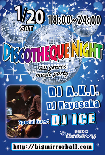 DISCO Groovy 2018年も 第3土曜日は! 【DJ A.K.I.】による《Discotheque Night》DISCO DJならではの絶妙なトーク&DJプレイにて横浜のサタデーナイトを盛り上げます! リクエストにも出来る限りお応え致しますのでDJまでお気軽にどうぞ♪ 今回はスペシャルゲストとして【DJ ICE】が登場し更に盛上げます☆ 【音楽】オールジャンル Soul、Funk、Dance Classics、Hip-Hop、R&B、New Jack Swing、EDM、Eurobeat、etc... 【開催時間】 18:00〜24:00 【ハッピーアワー料金 / 18:00〜19:00にご来店の方】 ●男性:¥2,500 / 2Drinks ●女性
