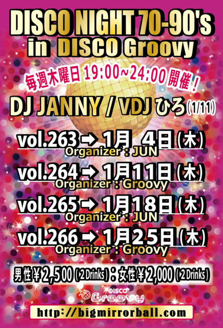 2018年1月も毎週木曜日は! おなじみユーロビート多めのディスコナイト♪ 70年代のSOULミュージックから最新のEDMまでオールヒットメドレー! Music Videoをふんだんに織り交ぜながら踊れる曲盛り沢山でお贈りします♬ 【Organized By DISCO Groovy】 【DJ】JANNY 【音楽】ALL GENRE (SOUL、竹の子、ダンクラ、EURO、HI-NRG、TECHNO、R&B、EDM、etc…) 【開催時間】 19:00〜24:00 【料金】 男性:¥2,500 / 2Drinks 女性:¥2,000 / 2Drinks ※バースディの御祝い等でケーキ・お花がご必要な場合は事前に当店スタッフ