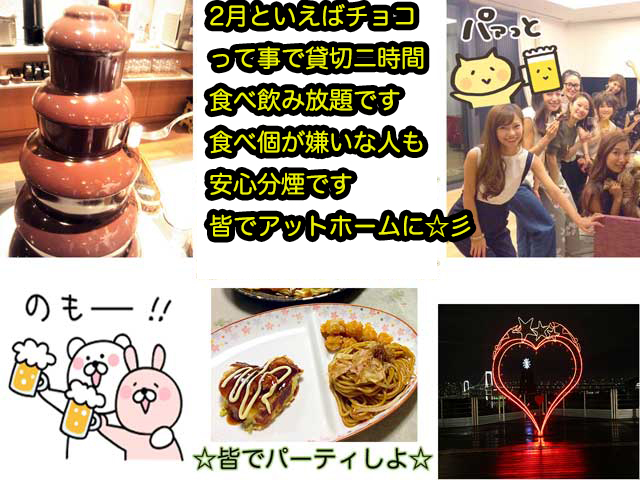 ★2・24(土)横浜・貸切2時間 先着30名・分煙・煙草が苦手な人も大丈夫☆食べ飲み放題+チョコレートファウンテンもあります★友活・恋活応援企画☆アットホームなパーティなので一人参加・初参加の方も安心☆ ● 勿論イベント参加不安て方は、同じ参加者さんやボランティアスタッフが居るLINEのグルチャに 招待します、下は21歳から上は50代まで居ますし 女子の方でも安心して参加できるよう、規約しっかりしていますので安心してご利用できます 希望者のみですので、お問い合わせ下さいね☆彡 ● この他にもイベン