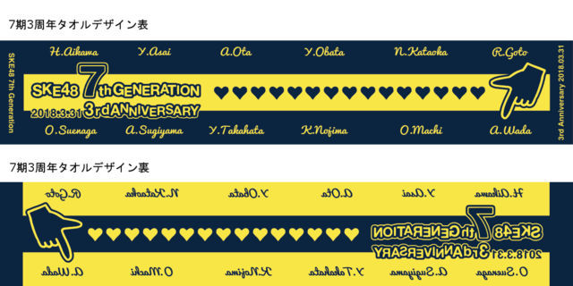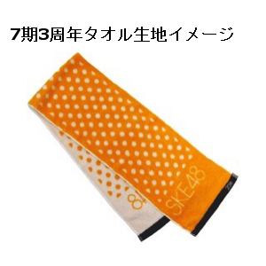 2018年3月31日SKE48 7期生がお披露目から3年を迎えるにあたり、7期生メンバーコミュニティ合同で記念品としてタオルを制作しプレゼントすることになりました。 希望者に制作にかかる費用をお支払い頂きタオルをお渡しさせて頂きます。 下記の注意事項をご確認の上、申し込みテンプレを参考にコメント・イベントにご参加ください。 ※タオル制作に時間がかかるため、例年より早い時期の受付、締切となっております。 ■タオル詳細 ・サイズ:約200mm×1100mm ・生地:ジャガードタオル (ナゴヤドームコンサート、2016年福袋に封入さ