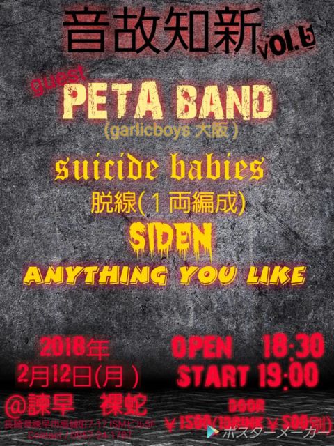 BAND LIVE 2018.2.18(Æü) Ĺºê ëÝÁástudioÍç¼Ø ¡¡¡ØÍç¼ØLIVE¡Ù -½Ð±é- ¾®À¥Îɿ𰽠/ æÀþ(°ìξÊÔÀ®) / ÒØè¸Íå / CHARLEMAGNE / CreamPuff / M.D.Specials / NRD open17:30 start18:00 Á°Çä¡ï1000 ÅöÆü¡ï1500¡Ü1drink ¡¡¢¨¥é¥¤¥Ö½ªÎ»¸å¡¢¤¤¤Á¤ªÊÄŹ¤È¤µ¤»¤Æ¤¤¤¿¤À¤¤Þ¤¹¤¬¡¢ ¡¡¡¡¤´Í×˾¤Ë±þ¤¸¤Æ±Ä¶È¤µ¤»¤Æ¤¤¤¿¤À¤¤Þ¤¹¤Î¤Ç¡¢ ¡¡¡¡£²£³»þ¤Þ¤Ç¤Ë¤ªÅÅÏò¼¤µ¤¤¡£µ¹¤·¤¯¤ª´ê¤¤Ãפ·¤Þ¤¹