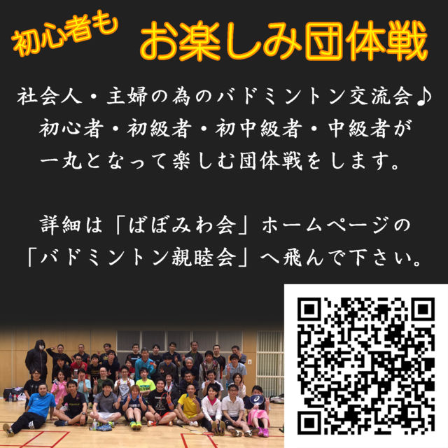 ¤¤¤Ä¤âÅìµþÅÔ¤ÎÅìÉô¤Ç¥Ð¥É¥ß¥ó¥È¥ó¤·¤Æ¤ë¥µ¡¼¥¯¥ë¤Ç¤¹¡£ ½é¿´¼Ô¤âÃæµé¼Ô¤â°ì½ï¤Ë³Ú¤·¤á¤ëÃÄÂÎÀï¤ò³«ºÅ¤·¤¿¤¤¤È»×¤¤¤Þ¤¹ ¾ÜºÙ¤Ï²èÁü¤Ë¤¢¤ëQR¥³¡¼¥É¤«¤é¸«¤Æ¤¯¤À¤µ¤¤