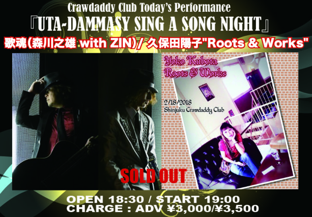 2/18 ËÜÆü¤Î¥é¥¤¥Ö¡¡ ¡ØUTA-DAMMASY SING A SONG NIGHT¡Ù ACT : ²Îº²¡Ê¿¹ÀîǷͺ with ZIN¡Ë/ µ×ÊÝÅÄÍÛ»Ò"Roots & Works" TIME : OPEN 18:30 / START 19:00 CHARGE : ADV ¡ï3,000/DOOR ¡ï3,500 SOLD OUT