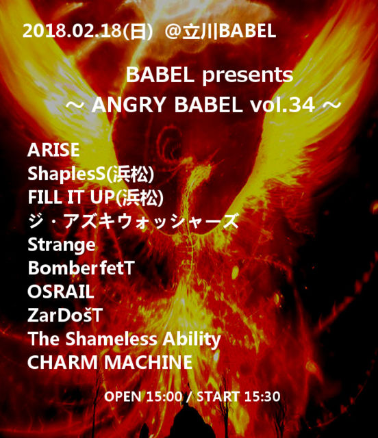 ¤É¤¦¤â¡¢¥æ¥¦¥¤Ç¤¹¡£ ´¨¤¤¤Í¡Á¡£Î䤨¤ë¤Í¡Á¡£ ¤³¤Î»þ´ü¤Ï¡¢ ¥¹¥¿¥¸¥ª¤Ç¥É¥é¥àᤤޤ¯¤Ã¤Æ´À¤«¤¤¤¿¸å¤Ë°û¤à ¿åÆ»¿å¤¬¸À¤¤¤è¤¦¤Î̵¤¤¤Û¤ÉÈþÌ£¤¤¡ª¡ª ¥¥ó¥¥ó¤ËÎ䤨¤Æ¤ë¤«¤é¤Ê¡ª¡ª ¤µ¤Æ¡¢¤½¤ì¤Ç¤Ï¥é¥¤¥Ö¹ðÃΡ£ ----------------------------------------------------------- 2018.02.18¡ÊÆü¡Ë¡÷ΩÀîBABEL ¡ÚBABEL pre ANGRY BABEL vol.34¡Û ¢£ARISE ¢£ShaplesS(É;¾) ¢£FILL IT UP(É;¾) ¢£¥¸¡¦¥¢¥º¥¥¦¥©¥Ã¥·¥ã¡¼¥º ¢£Strange ¢£BomberfetT ¢£OSRAIL ¢£ZarDošT ¢£ The Shameless Ability ¢£CHARM MACHINE OPEN 15:0