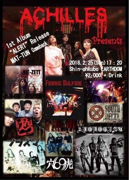 2018年2月25日(日) 新大久保アースダム http://www1.odn.ne.jp/shinjuku-dom/index.html/dom.html ACHILLES presents 「ALERT」release &MAT-TUN comeback GIG OPEN 17:20 START 17:40 charge \2000+1drink 〈出演〉 17:40〜18:05 NIE-ZETT 18:15〜18:40 プラズマ 18:50〜19:15 げんこつ 19:25〜19:50 Southdelta 20:00〜20:25 穴虎69 20:35〜21:00 Ferric Sulfide 21:10〜21:35 APOROGIST 21:45〜22:20 ACHILLES