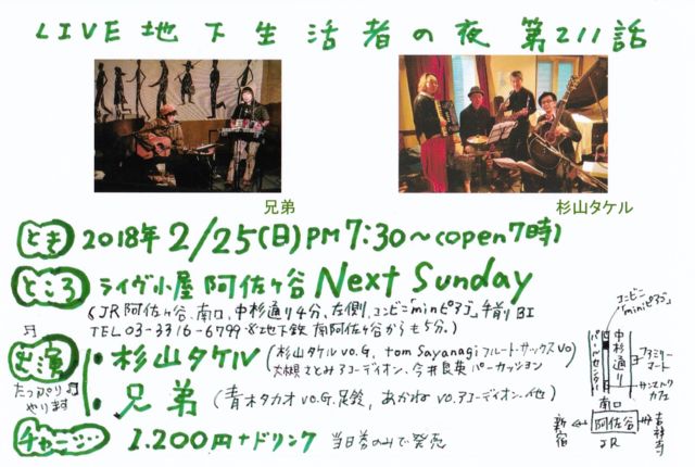 2018年●2月25日(日) 夜7時半〜「地下生活者の夜 第211話」冬地下 場所・ライブ小屋、阿佐ヶ谷 Next Sunday にて (JR阿佐ヶ谷南口、中杉通り4分左側。コンビニ「miniピアゴ」手前B1TEL03-3316-6799)1200円+ドリンク OPEN 19:00/START 19:30 出演 ●杉山タケル 杉山タケル(vo.G) tom Sayanagi(フルート サックス ボーカル) 大槻 さとみ(アコーディオン) 今井良英(パーカッション) 後藤勇(ベース) ●兄弟 青木タカオ(vo.G.足鈴) あかね(vo.ピアニカ・他) ・・・・・・・・ 兄弟と杉山タケルバンドの二年振り