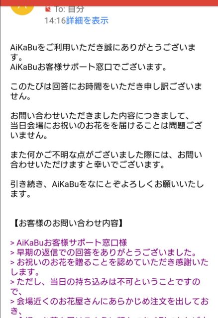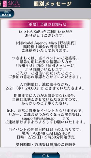 2/25(日)にアイカブの臨時株主総会と称して野村実代さんのソロイベントが開催されます。 アイカブガチ勢だと本人自らがアピールしてきて掴んだとも言える初めてのソロイベントとなります。 お祝いの気持ちを伝えるとともに少しでも華やかさを添えられたらなあと、楽屋花のような形でお花を贈りたいと計画をしています。 アイカブ運営様とのメールでのやり取りで、花屋さんに注文をして当日のイベント会場に届けてもらうという形であれば問題はないとの回答をいただけました。 イベント会場の場所が当選者へ連絡があり、秋葉原のAKBカフェ&ショップ