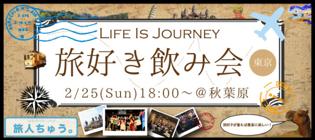 秋葉原で開催! 東京付近の旅好きが集まるオフ会♫ 情報交換や友達作りにどうぞ★ http://event-chu.com/20180225_tokyo/ イベント情報 ■開催日 2018年2月25日(日) ■開催時間 18:00〜20:00 遅れて参加もOKです! 終了後2次会も開催予定。 ■受付時間 17:30〜 開催場所 ・京ほのか 秋葉原店 ・東京都千代田区神田佐久間町1丁目15 川初ビル 7F アクセス ・秋葉原駅から徒歩0分 駅からすぐ ■参加費 ♂男性4500円 ♀女性4000円 ■開催人数 30〜40名程度 形式 飲み放題&コース料理 申し込み http://event-chu.com/20180