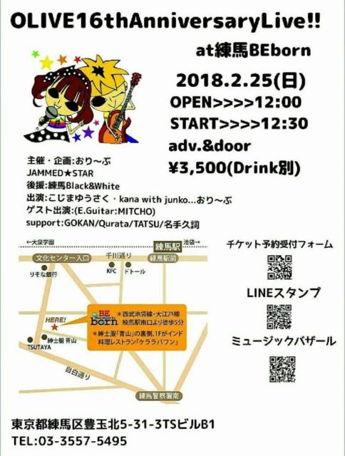 練馬music & live bar BEborn 本日、2月25日(日曜日)は、 【おり〜ぶ16周年企画イベント】 主催:おり〜ぶ open 12:00 start. 12:30 charge 3,500円 (別途1Dr500円) 【お気楽ライブバンド企画】 夜の部 open 19:00 start 19:45 charge 1600円 (1ドリンク付) ★19:45-20:15 シャーセーズ ★20:30-21:00 SunFlowerKing 明日、2月26日(月曜日)は、 【ブルースセッション】 ★お気楽ライブ(ノルマ無し)出演者募集中! お気楽ライブ詳細 お気楽ライブとは、出演者の皆様が、お互いのお客様となり プロ、アマを問わず楽しくラ