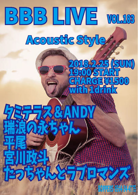 BBB LIVE 183 Acoustic Style 2018.2.25 (SUN) 19:00 START CHARGE \1500 with 1drink ¥¿¥ß¥Æ¥é¥¹¡õANDY ¿ðϲ¤Î±Ê¤Á¤ã¤ó Ê¿Èø µÜÀîÀ¯ÅÍ ¤¿¤Ã¤Á¤ã¤ó¤È¥é¥Ö¥í¥Þ¥ó¥º