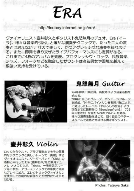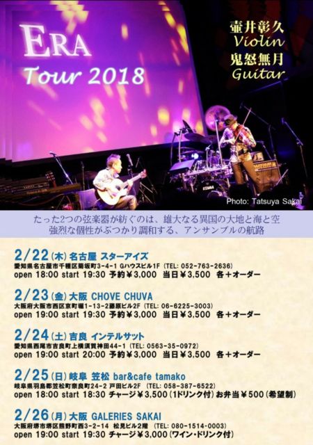 #ERA_LIVE ¡ú2018/2/26(mon) ERA:ÄÛ°æ¾´µ×vl,µ´ÅÜ̵·îg at Âçºå ºæ GALERIES SAKAI https://galeries-sakai.localinfo.jp/ open 19:00 start 19:30 ¥Á¥ã¡¼¥¸¡ï3,000 (¥ï¥¤¥ó¡¦¥É¥ê¥ó¥¯ÉÕ) ¡ú¤è¤í¤·¤¯¤ª´ê¤¤¤·¤Þ¤¹¡ª