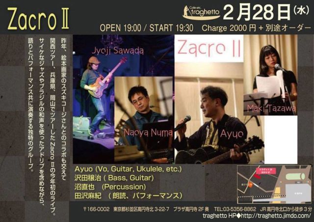 2·î28Æü¡¡(¿å¡Ë19:00 open 19:30 start ºòǯ¡¢´ØÀ¾¥Ä¥¢¡¼¡¢Ê¼¸Ë¸©¡¢²¬»³¤Ç¥Ä¥¢¡¼¤·¤¿Zacro ¶¤Îº£Ç¯½é¤Î¥é¥¤¥Ö¡£¥µ¥¤¥±¤Ê¥¸¥ã¥º¤ä¥Ö¥é¥¸¥ë¤ÎÏÂÀ¼¤ò»È¤Ã¤¿¥¢¥É¥ê¥Ö¤ò´Þ¤á¤Ê¤¬¤é¡¢¸ì¤ê¤È¥Ñ¥Õ¥©¡¼¥Þ¥ó¥¹¶¦¤Ë±éÁÕ¤¹¤ëÆÈÆÃ¤Î¥°¥ë¡¼¥×¡£ °ÊÁ°ÃÓÂÞ¤ÎÎë¤ó¾®²°¤ÎͽÄê¤Ç¤¢¤Ã¤¿¥é¥¤¥Ö¤¬¤³¤Á¤é¤Ë¤Ê¤ê¤Þ¤·¤¿¡£ ¤è¤í¤·¤¯¤ª´ê¤¤¤·¤Þ¤¹¡£ ¡¡¡¡¡¡¡¡¡¡¡¡Zacro ¶ Ayuo (Vo, Guitar, Ukulele, etc.) ÂôÅľ÷¼£( Bass, Guitar) ¾ÂľÌé¡¡(Drums) ÅÄÂôË㵪¡¡(ϯÆÉ¡¢¥Ñ¥Õ¥©¡¼¥Þ¥ó¥¹¡Ë ¥Á¥ã¡¼¥¸¡§2000±ß + ¥ª¡¼¥À¡¼ ²ñ¾ì¡§¥È¥é¥²¥Ã¥È ¢©166-0002¡¡ÅìµþÅÔ¿ùʶè