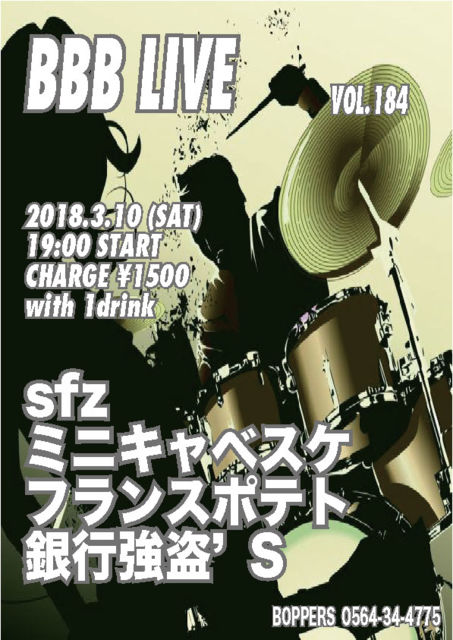 BBB LIVE 184 2018.3.10 (SAT) 19:00 START CHARGE \1500 with 1drink sfz ¥ß¥Ë¥¥ã¥Ù¥¹¥± ¥Õ¥é¥ó¥¹¥Ý¥Æ¥È ¶ä¹Ô¶¯Åð¡ÇS