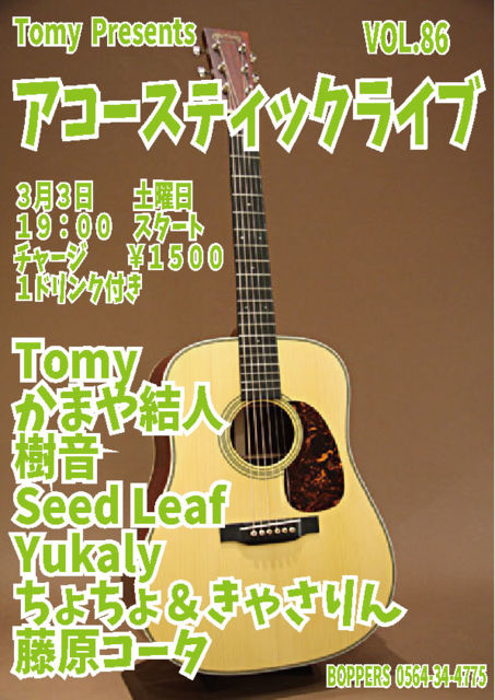 Tomy Presents アコースティックライブ 86 3月3日 土曜日 19:00 スタート チャージ¥1500 1ドリンク付き Tomy かまや結人 樹音 Seed Leaf Yukaly ちょちょ&きゃさりん 藤原コータ