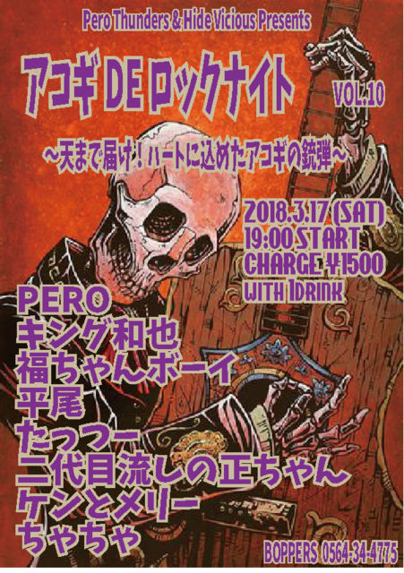 Pero Thunders & Hide Vicious Presents アコギDEロックナイト vol.10 2018.3.17 (SAT) 19:00 START CHARGE \1500 with 1drink PERO キング和也 福ちゃんボーイ 平尾 たっつー 二代目流しの正ちゃん ケンとメリー ちゃちゃ